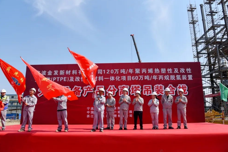 8月16日,一體化項目60萬噸/年P(guān)DH裝置大型設(shè)備產(chǎn)品分離塔第六段吊裝一次成功。