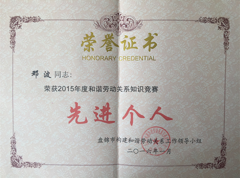 為貫徹黨的十八屆四中全會精神,推進人力資源和社會保障法制建設(shè)進程,切實提高構(gòu)建和諧勞動關(guān)系的能力和水平,根據(jù)《中共中央、國務(wù)院關(guān)于構(gòu)建和諧勞動關(guān)系的意見》文件精神,2015年11月份,在我市范圍內(nèi)開展了和諧勞動關(guān)系知識競賽活動,此次競賽有256戶企業(yè)近2500名勞動者參與,我公司鄧波同志在此次知識競賽中,表現(xiàn)優(yōu)異,榮獲“先進個人”稱號。