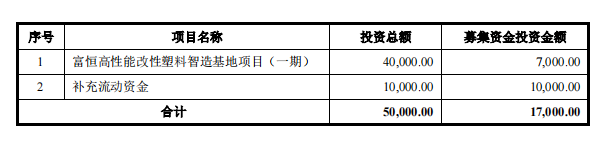 本次公司擬公開(kāi)發(fā)行人民幣普通股不超過(guò)2280萬(wàn)股,募集資金1.7億元,用于建設(shè)富恒高性能改性塑料智造基地項(xiàng)目(一期)等。