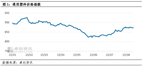 2023年8月至今(8月16日)塑料價(jià)格指數(shù)形成震蕩走勢(shì),價(jià)格重心小幅下移,8月16日收于872.5,較月初下移0.78點(diǎn),實(shí)際走勢(shì)與《塑料價(jià)格指數(shù)初現(xiàn)彩虹,但難以維系》中預(yù)測結(jié)論一致。價(jià)格波動(dòng)的原因在于國內(nèi)需求恢復(fù)不及預(yù)期,然而塑料產(chǎn)量隨著檢修結(jié)束進(jìn)一步走高,原油市場走勢(shì)雖然跌宕起伏,但仍處于高位,對(duì)塑料市場產(chǎn)生支撐。