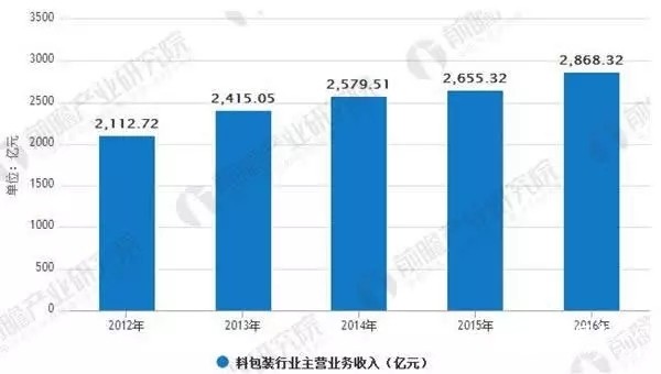 中國塑料包裝行業(yè)規(guī)模龐大,近年來保持持續(xù)穩(wěn)定增長。據(jù)前瞻產(chǎn)業(yè)研究院發(fā)布的《塑料包裝行業(yè)產(chǎn)銷需求與投資預測分析報告》數(shù)據(jù)顯示,2016年中國塑料包裝行業(yè)實現(xiàn)產(chǎn)品銷售收入2868.32億元,同比增長8.02%,近5年復合增長率達7.94%。