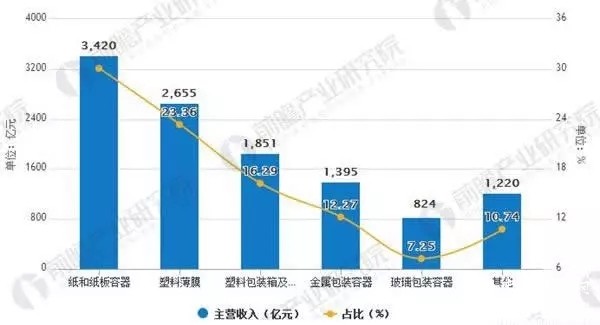 2015年我國各類包裝細分行業(yè)的主營業(yè)務收入分布情況